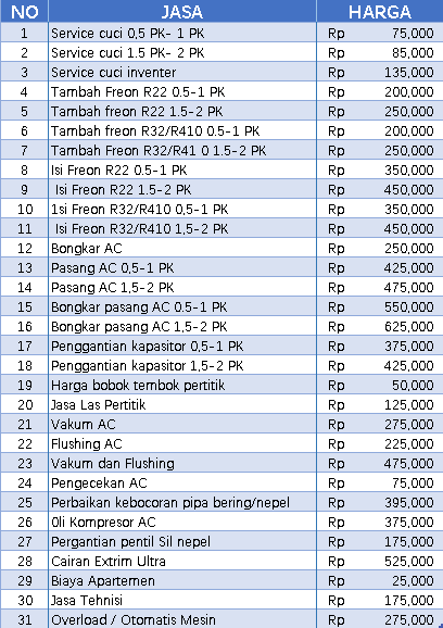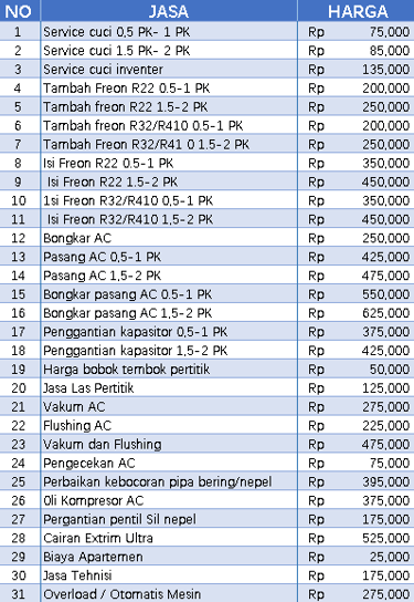 ** Tidak dikenakan biaya pengecekan apabila menggunakan jasa lainya. Biaya ini dikenakan apabila tidak jadi menggunakan jasa service ac lain yang tertera diatas.