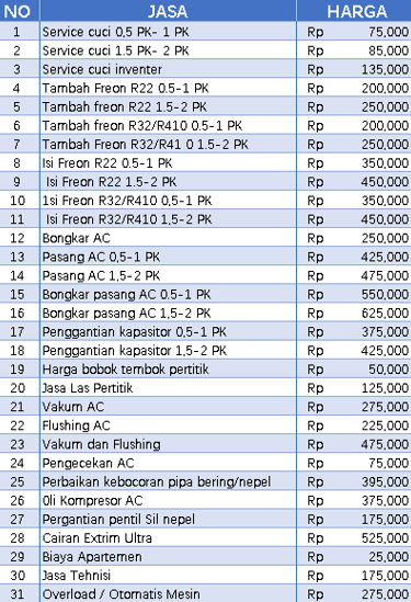 ** Tidak dikenakan biaya pengecekan apabila menggunakan jasa lainya. Biaya ini dikenakan apabila tidak jadi menggunakan jasa service ac lain yang tertera diatas.